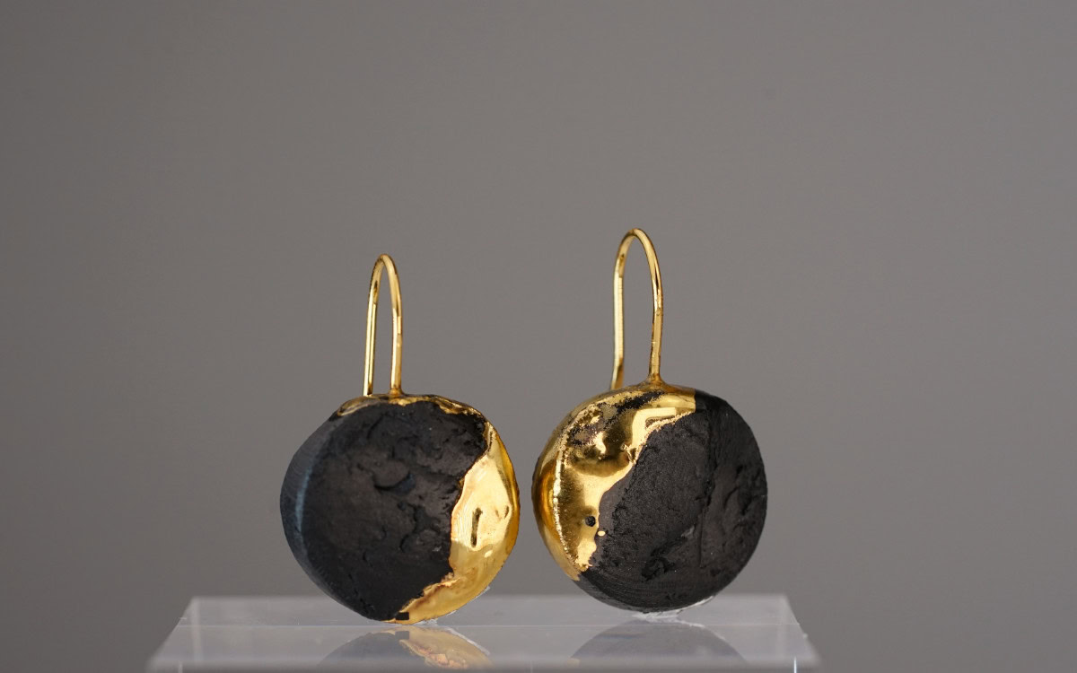 Round earring made of black porcelain, refined with 24 K ceramic gold and 925 sterling silver. Handcrafted and sustainably made in the heart of Europe.