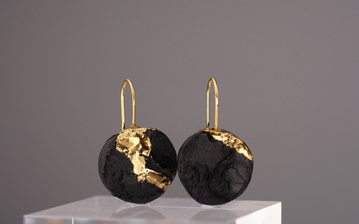 Round earring made of black porcelain, refined with 24 K ceramic gold and 925 sterling silver. Handcrafted and sustainably made in the heart of Europe.