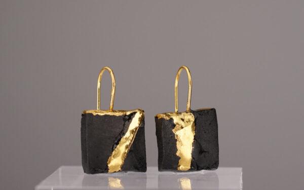 The Black Gold Square 40 – a rectangular earring crafted from deep black porcelain, refined with 24-karat ceramic gold and finished with a 24-karat gold-plated 925 sterling silver hook.