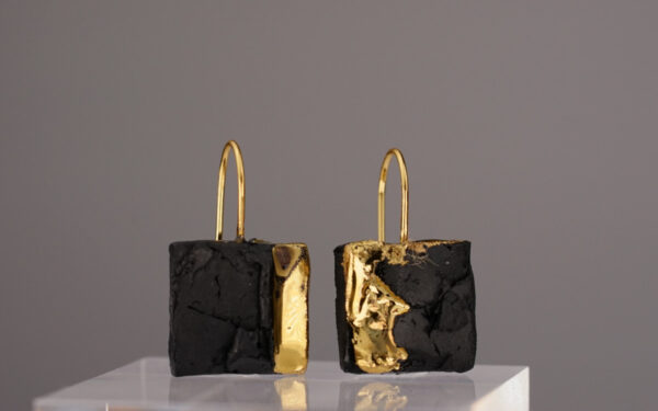 The Black Gold Square 41 – a rectangular earring crafted from deep black porcelain, refined with 24-karat ceramic gold and finished with a 24-karat gold-plated 925 sterling silver hook.