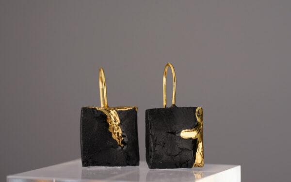 The Black Gold Square 73 – a rectangular earring crafted from deep black porcelain, refined with 24-karat ceramic gold and finished with a 24-karat gold-plated 925 sterling silver hook.