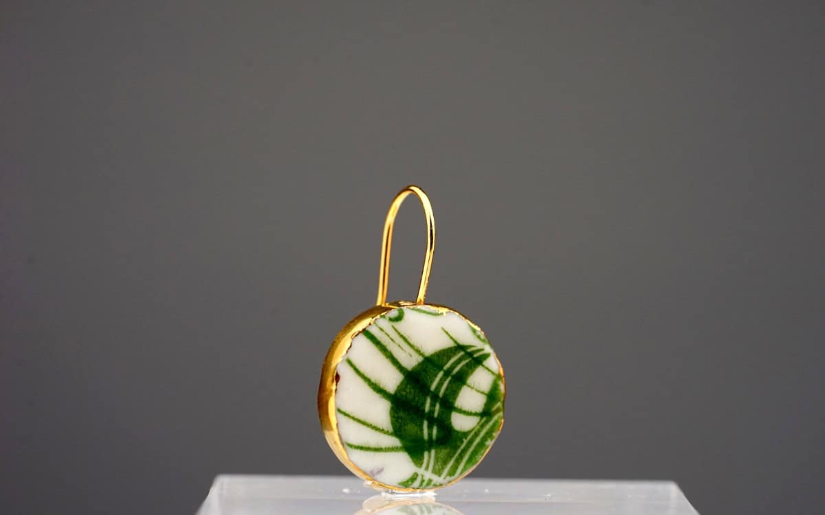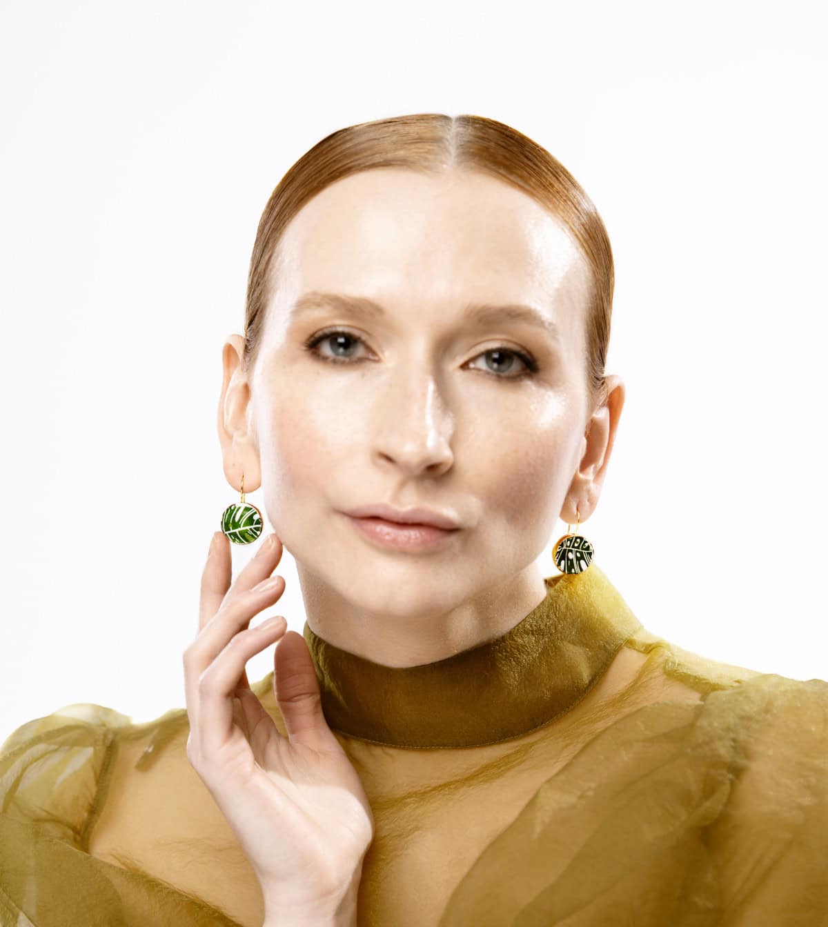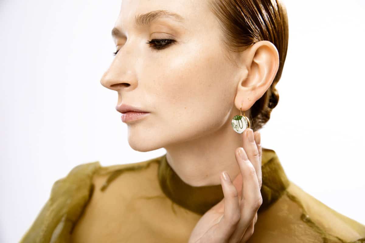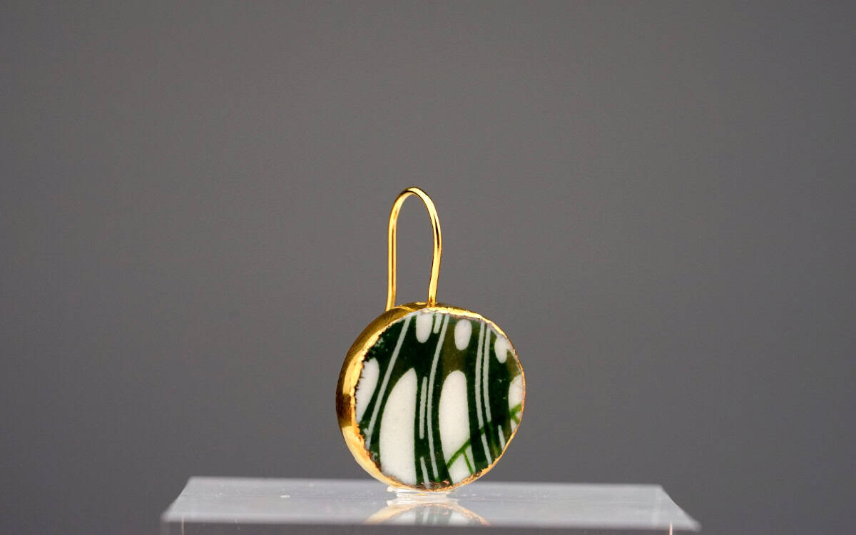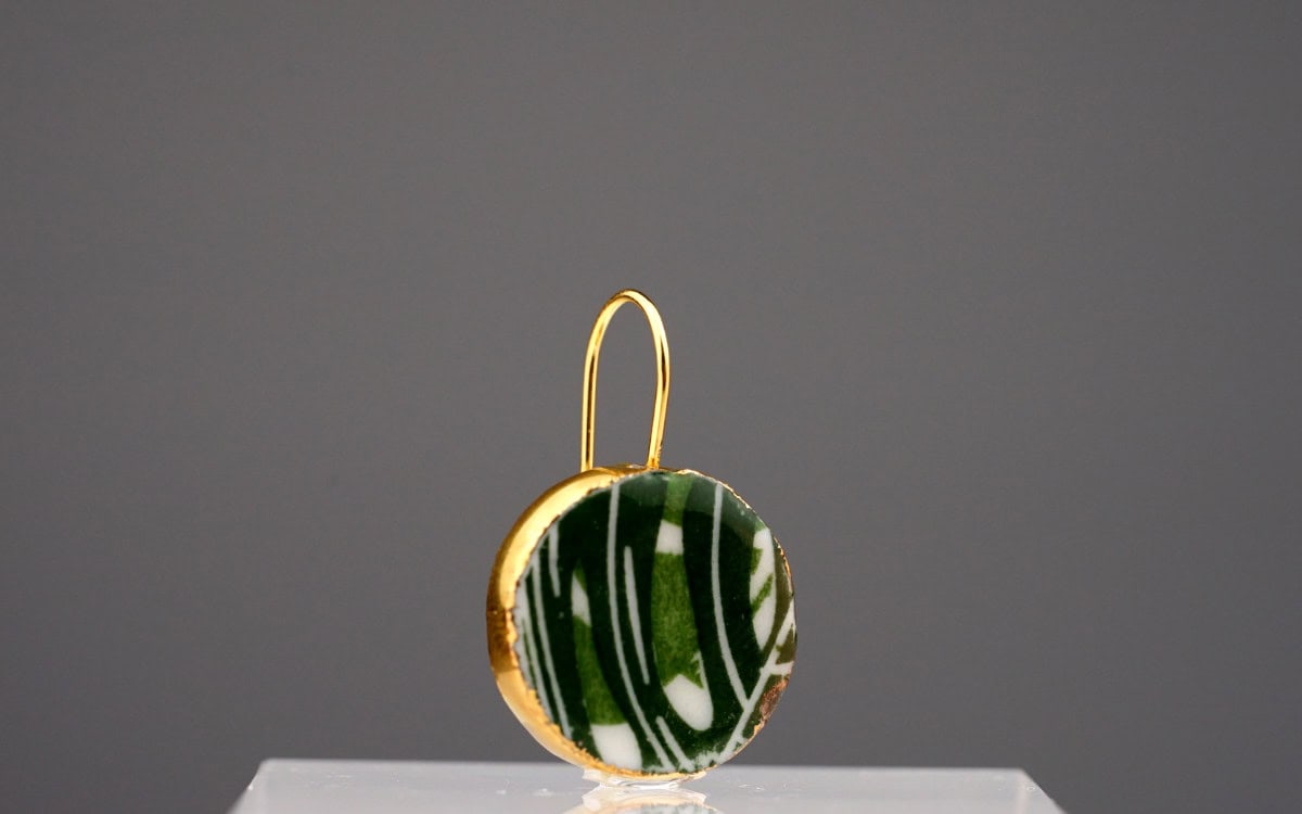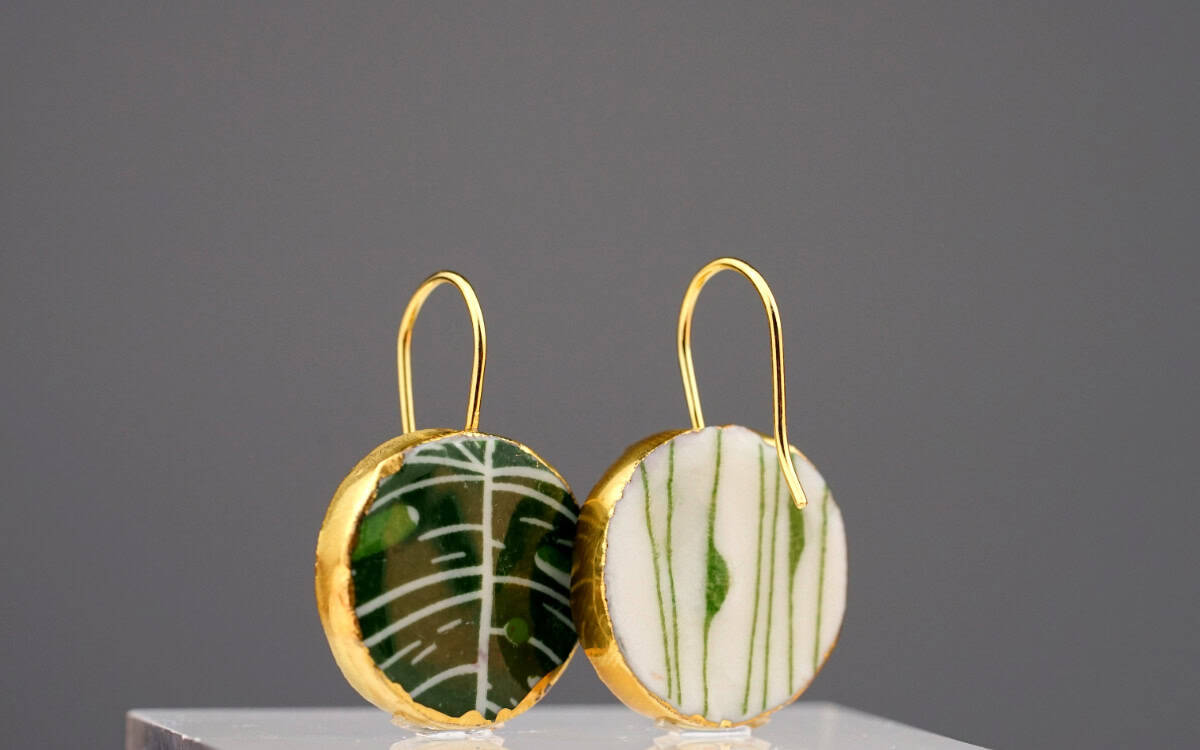 These earrings combine vibrant green tones and delicate leaf patterns with an elegant 24-karat ceramic gold frame. Their double-sided design ensures a harmonious appearance from every angle.